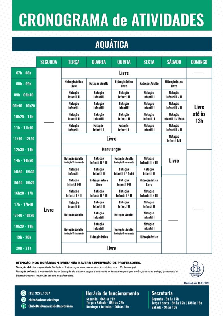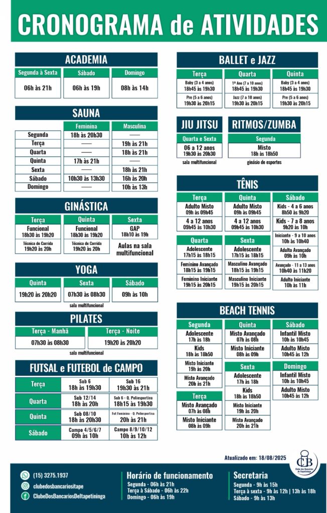 Confira aqui o nosso cronograma completo para 2026 com as atividades oferecidas aqui no Clube dos Bancários.